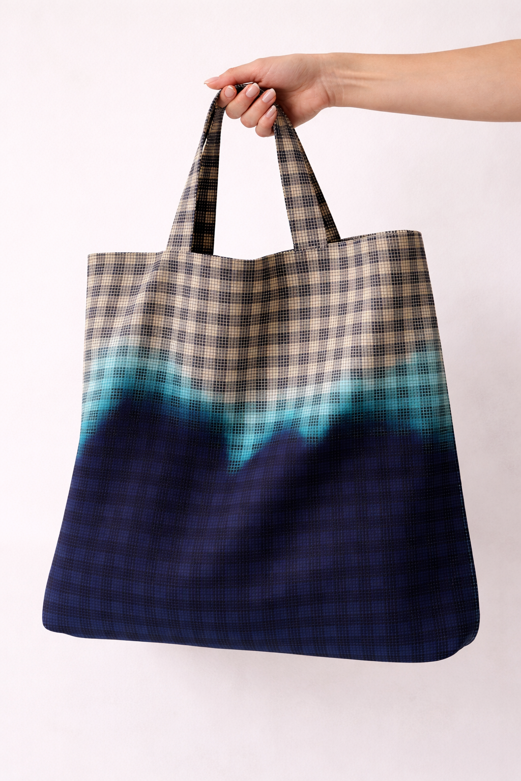 A medium-weight jacquard check fabric featuring a woven dip-dye effect that repeats every 50 cm. It has a semi-structured handle and a gentle drape, making it suitable for clothing and accessories.