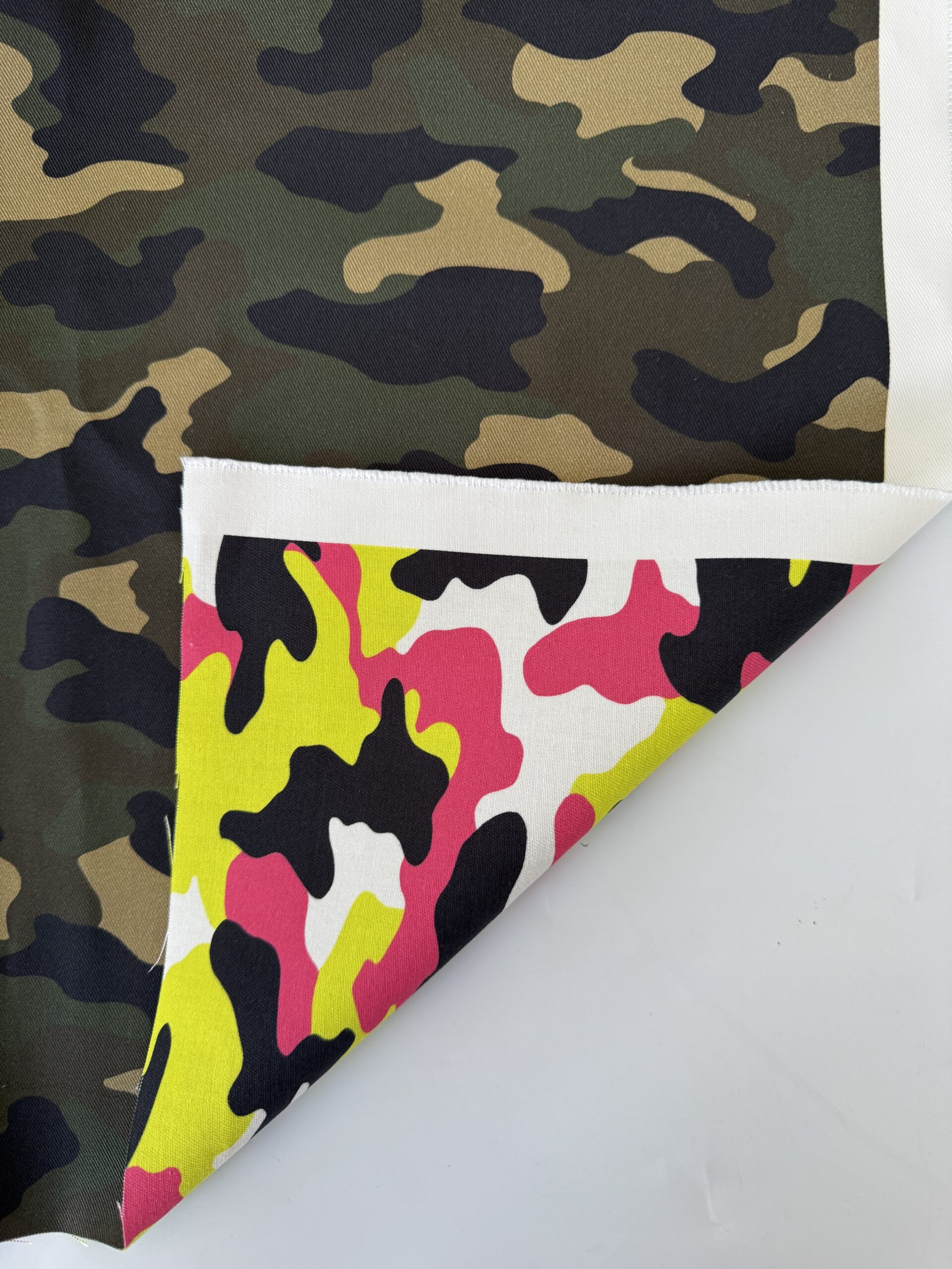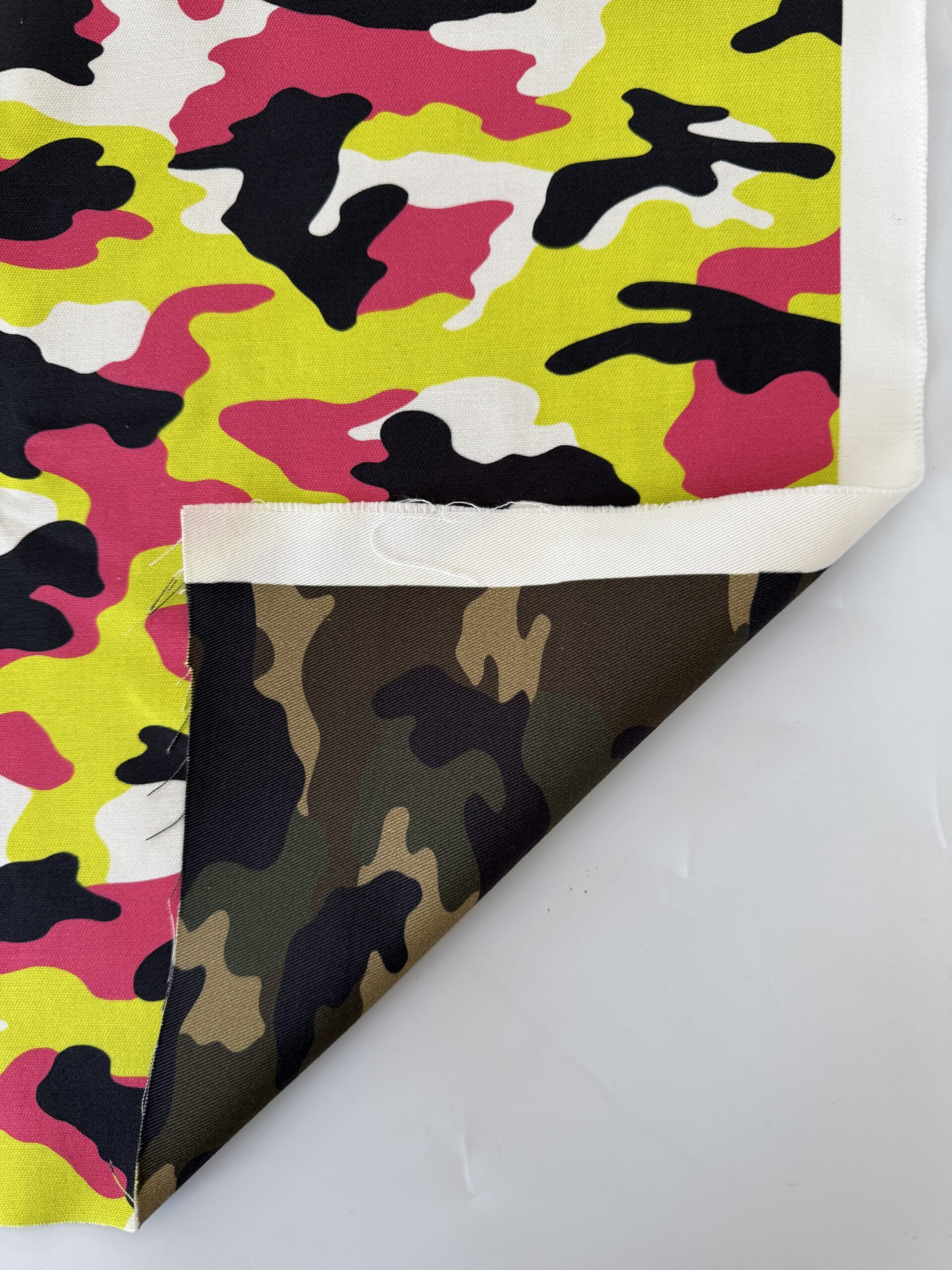 Double face cotton twill camouflage with a smooth, medium-weight handle. One side features classic military camo in muted greens, while the reverse offers a bold neon camo in yellow, pink, black, and white. Durable, breathable, and ideal for reversible garments, jackets, and accessories.