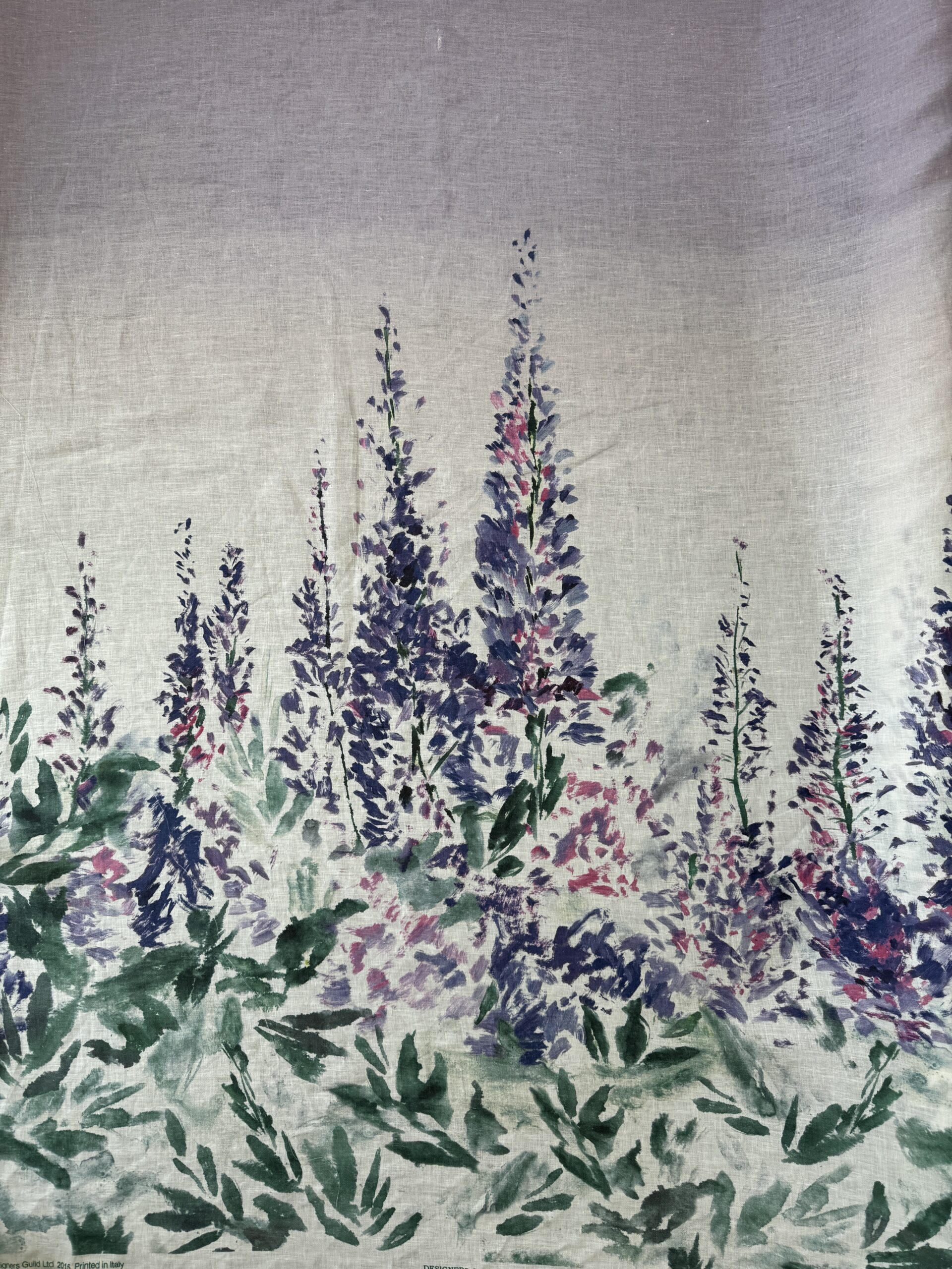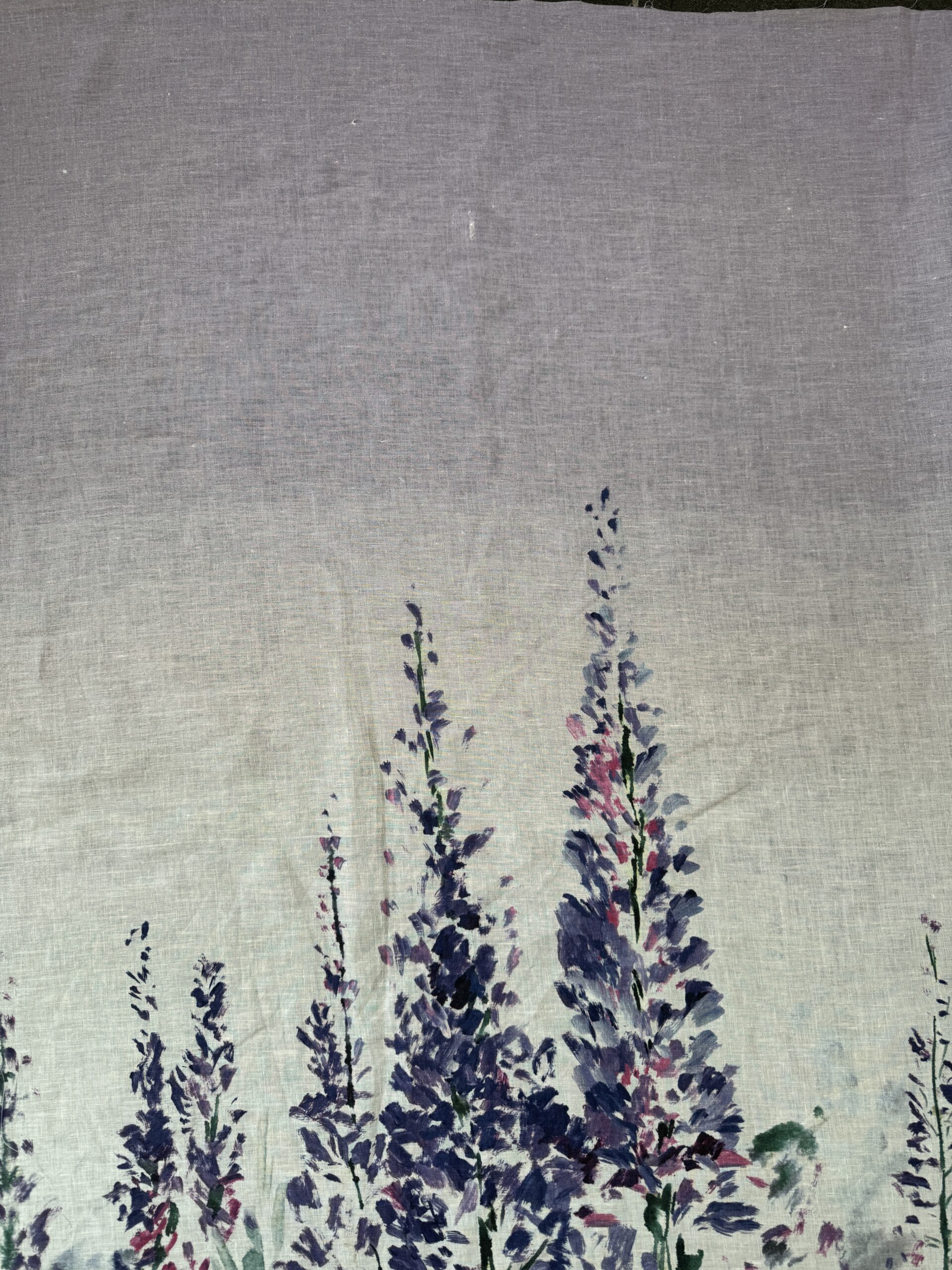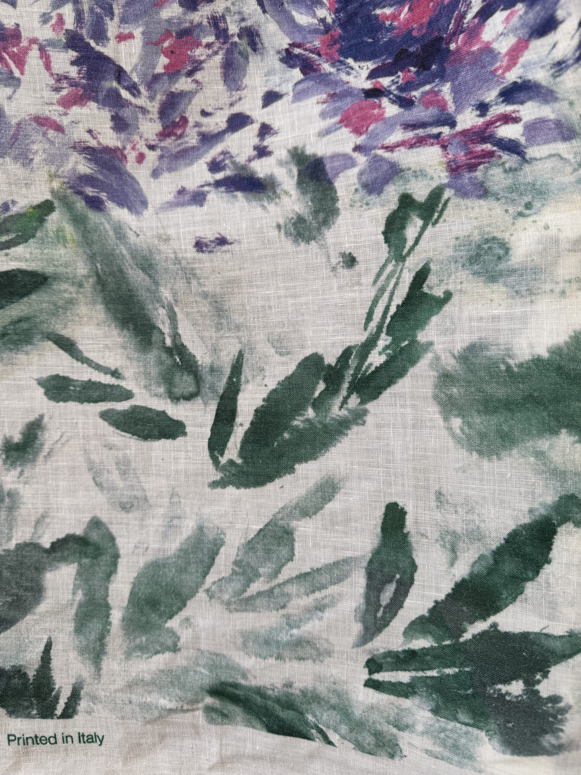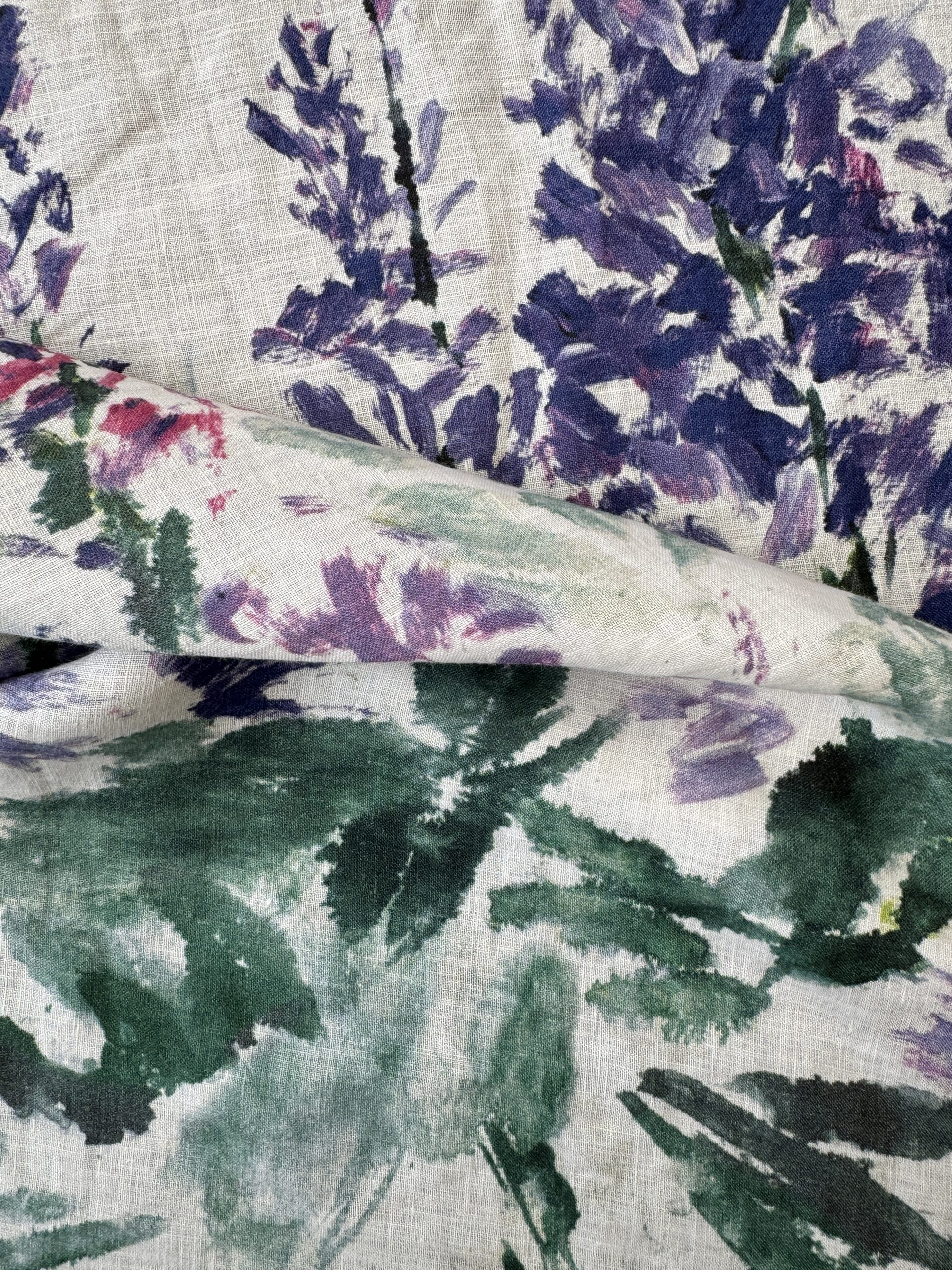 This linen with a beautiful floral border print on an off-white base, featuring an ombré top border. Medium weight with a soft, natural drape. Perfect for summer garments, and more. Made in Italy.