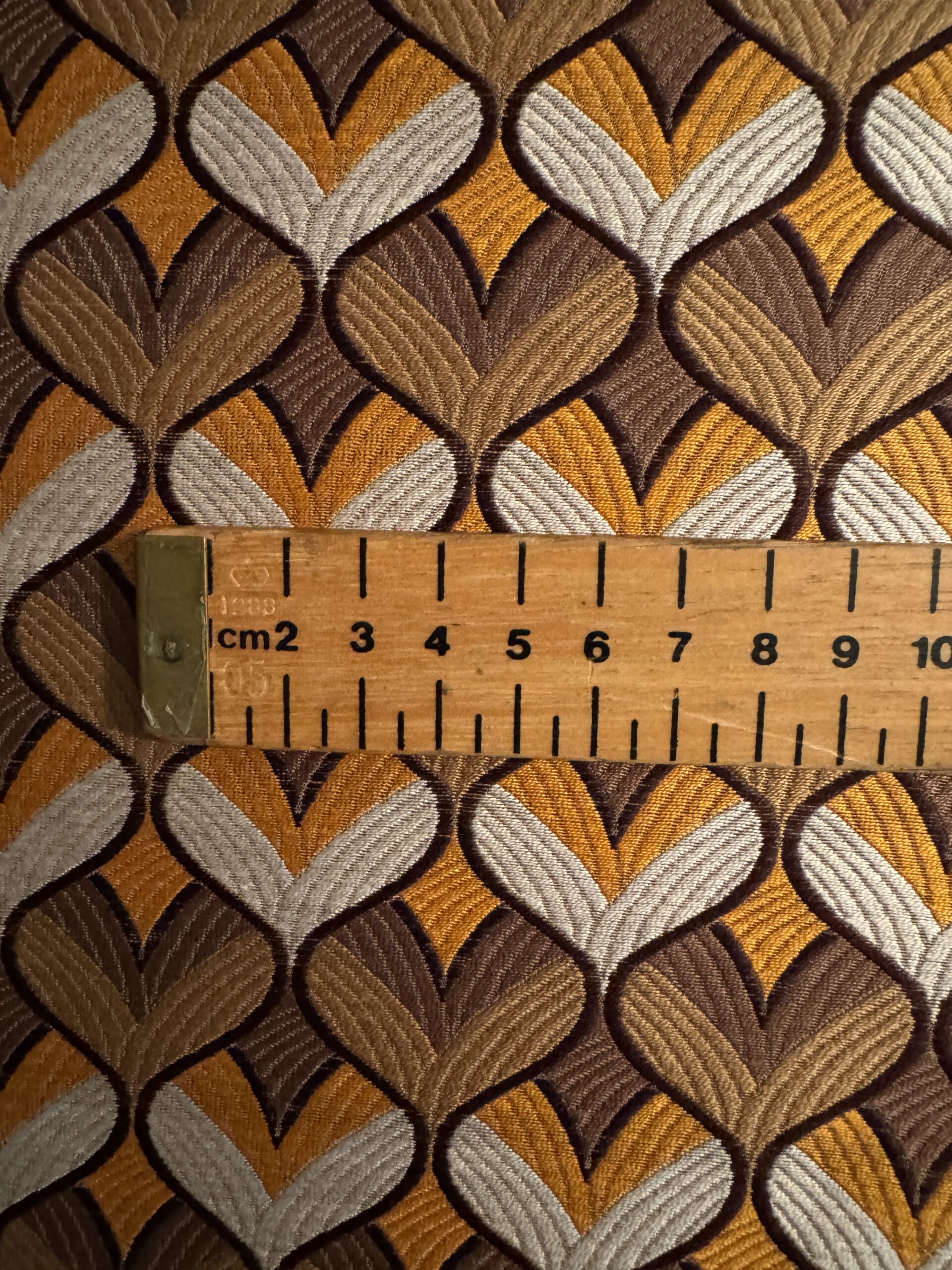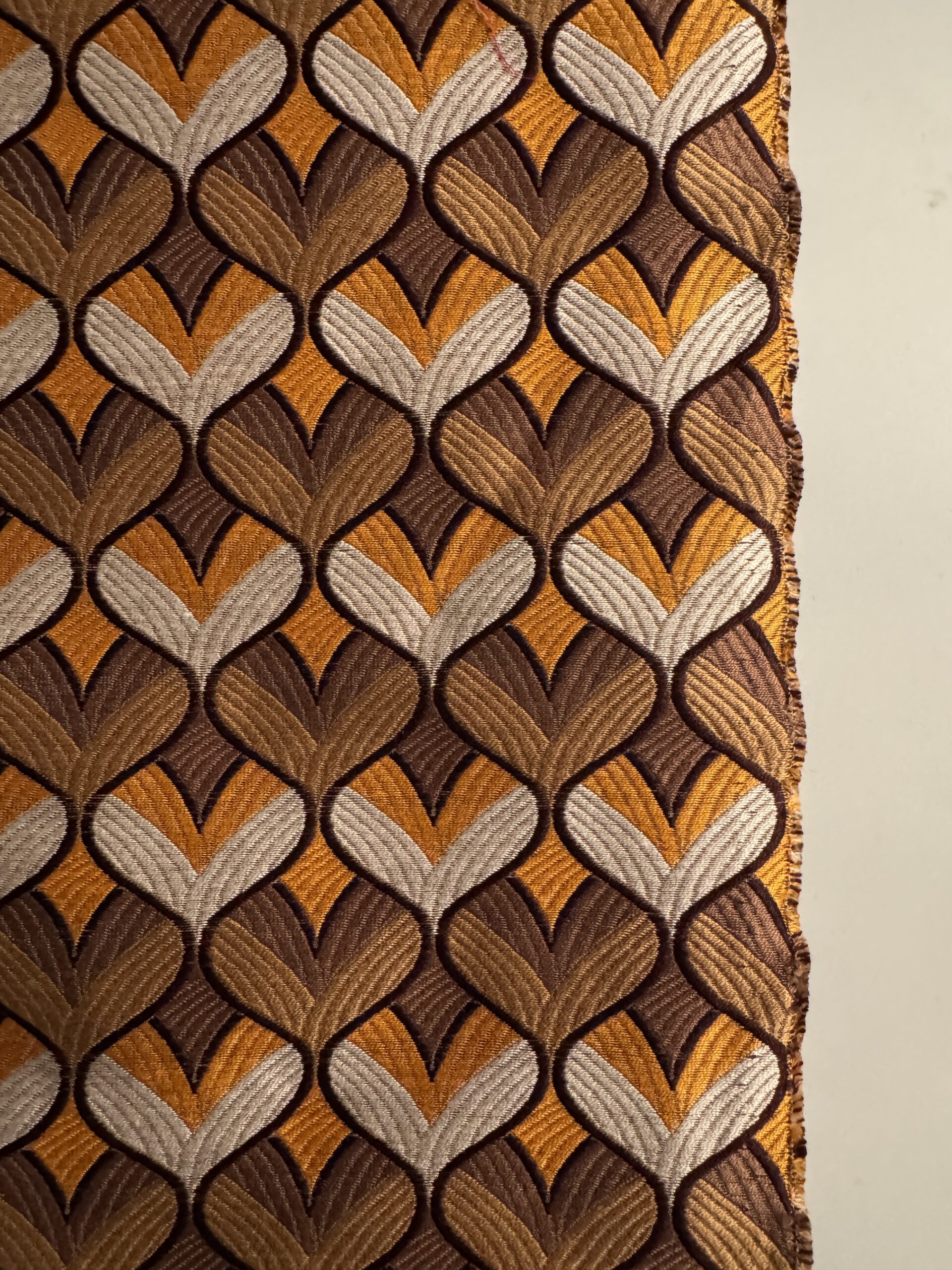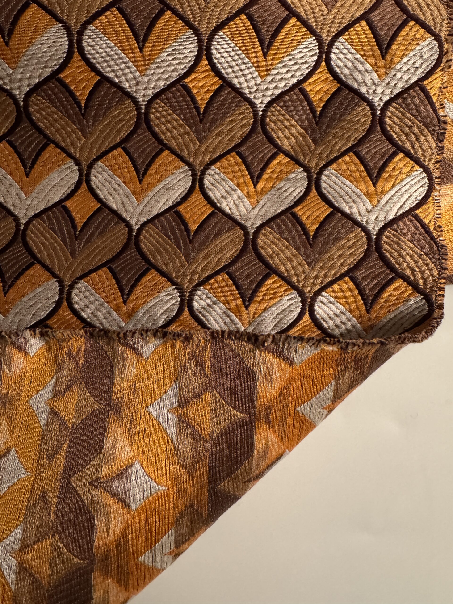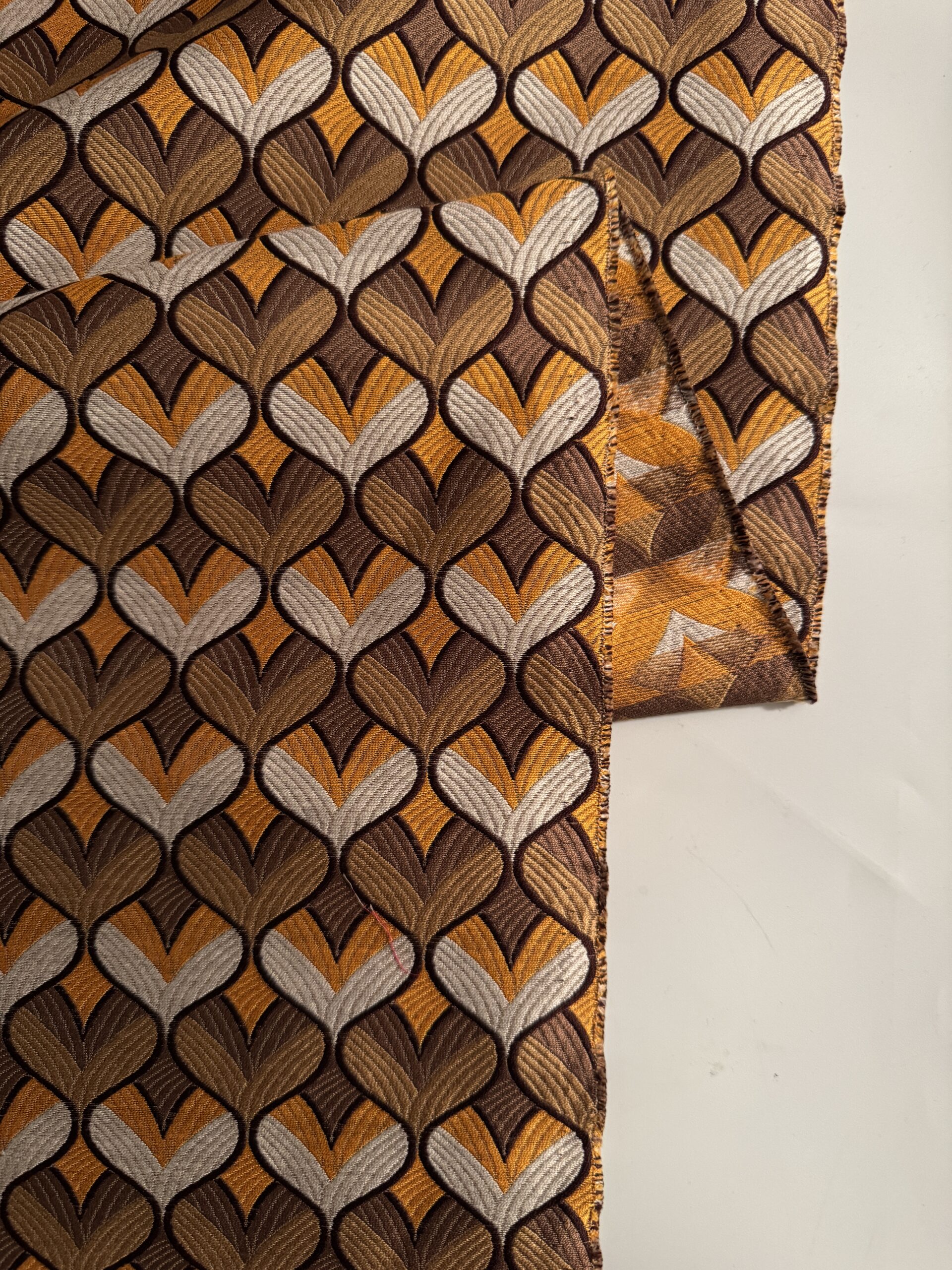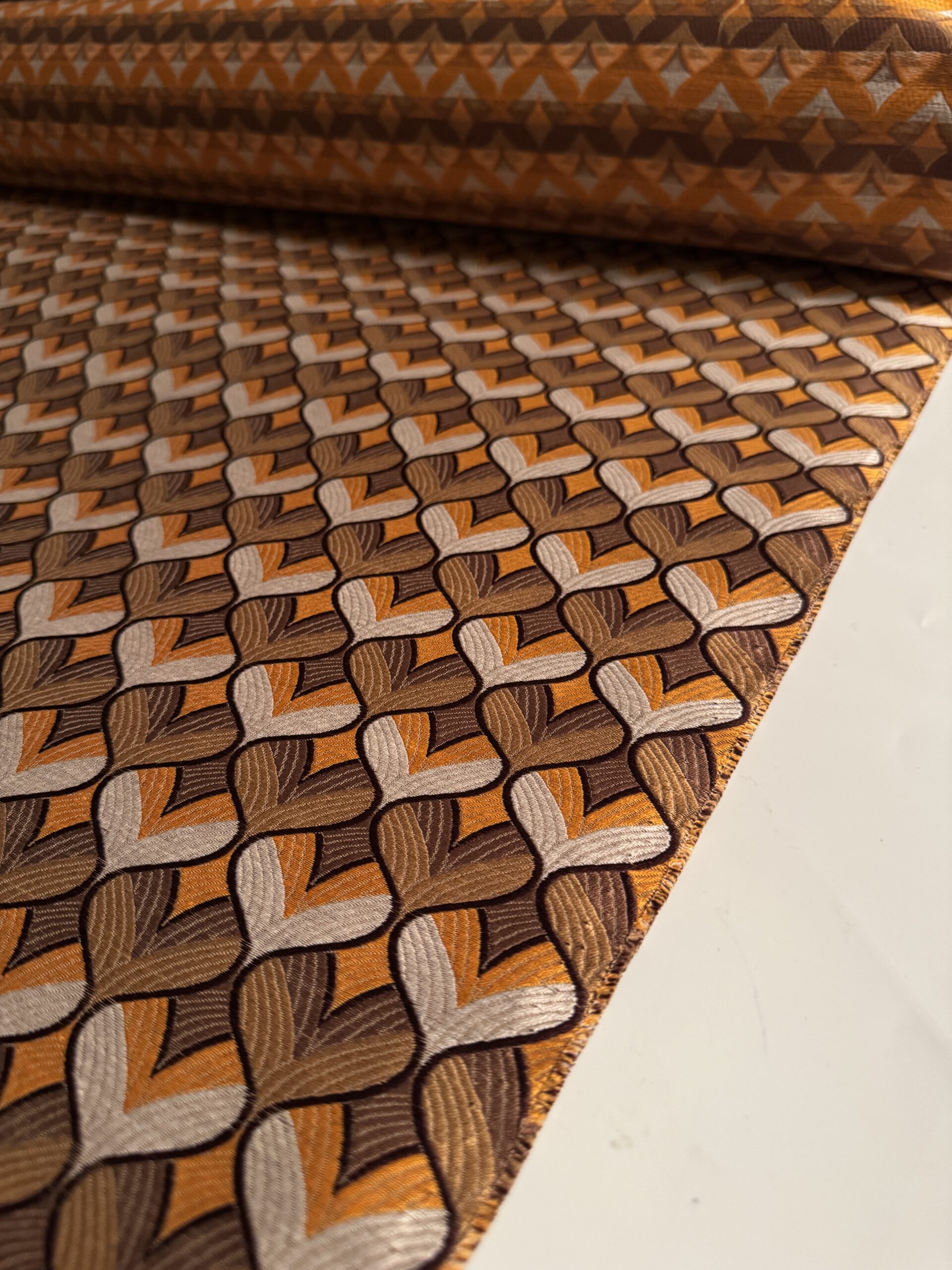 A medium-heavyweight jacquard woven with a rich geometric pattern in warm golds, browns, and cream. The cottonโsilk blend gives it a structured feel with a subtle sheen, perfect for jackets, skirts, statement trousers, and refined accessories.