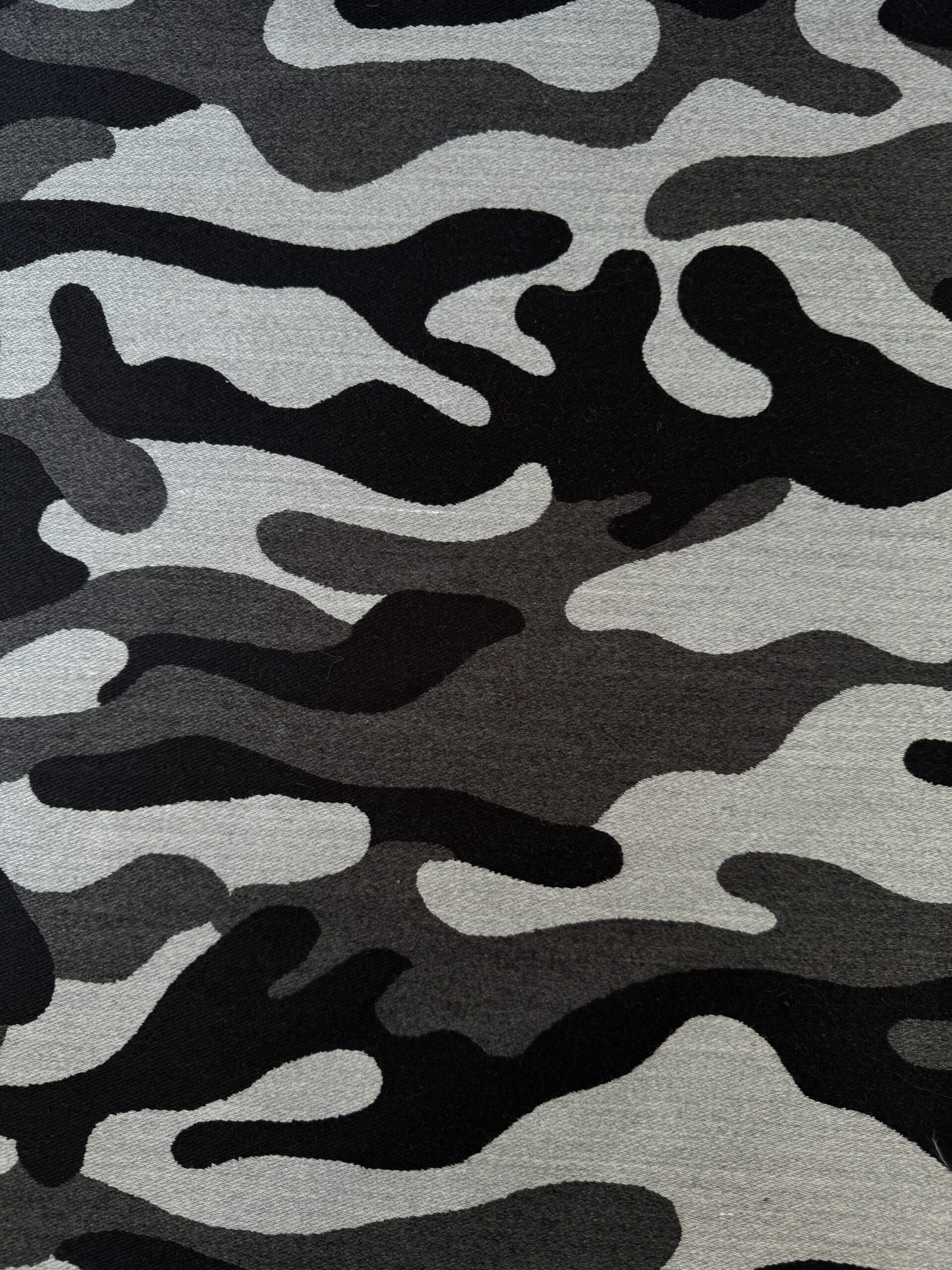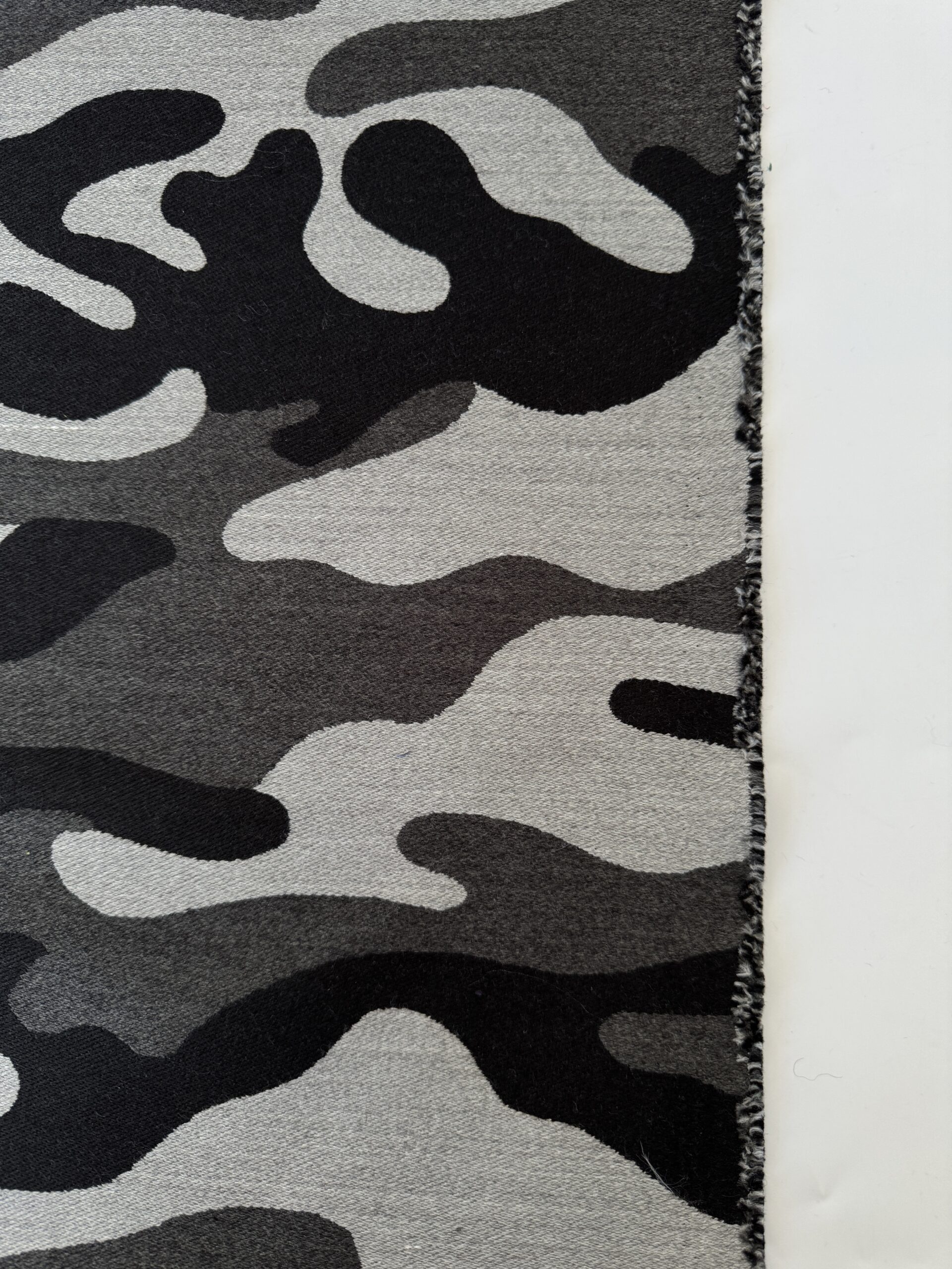 A heavyweight wool-blend jacquard with a bold camouflage pattern in shades of black, charcoal, and grey. Dense and warm with a soft, structured handle, making it ideal for outerwear, coats, jackets, and acessories
