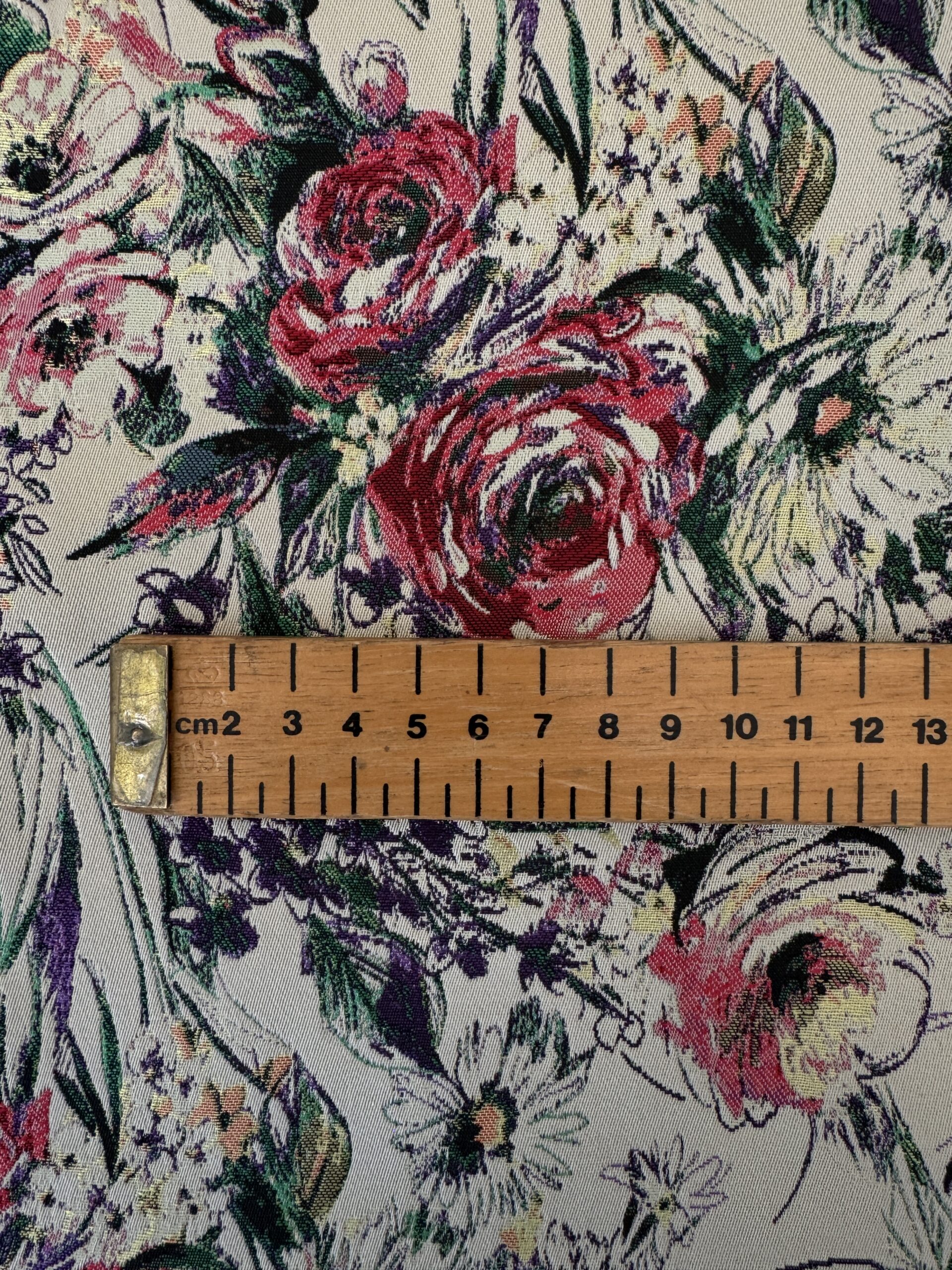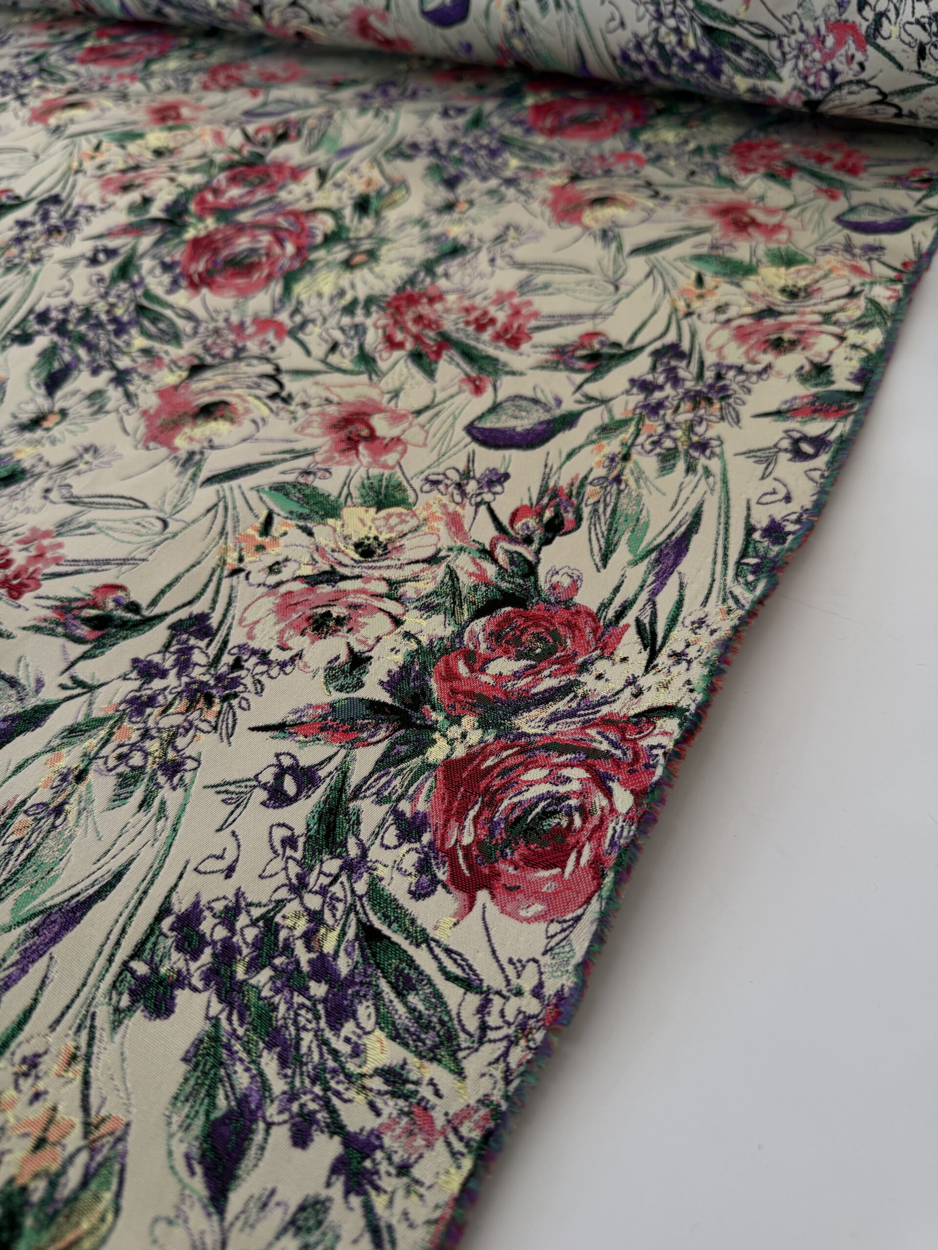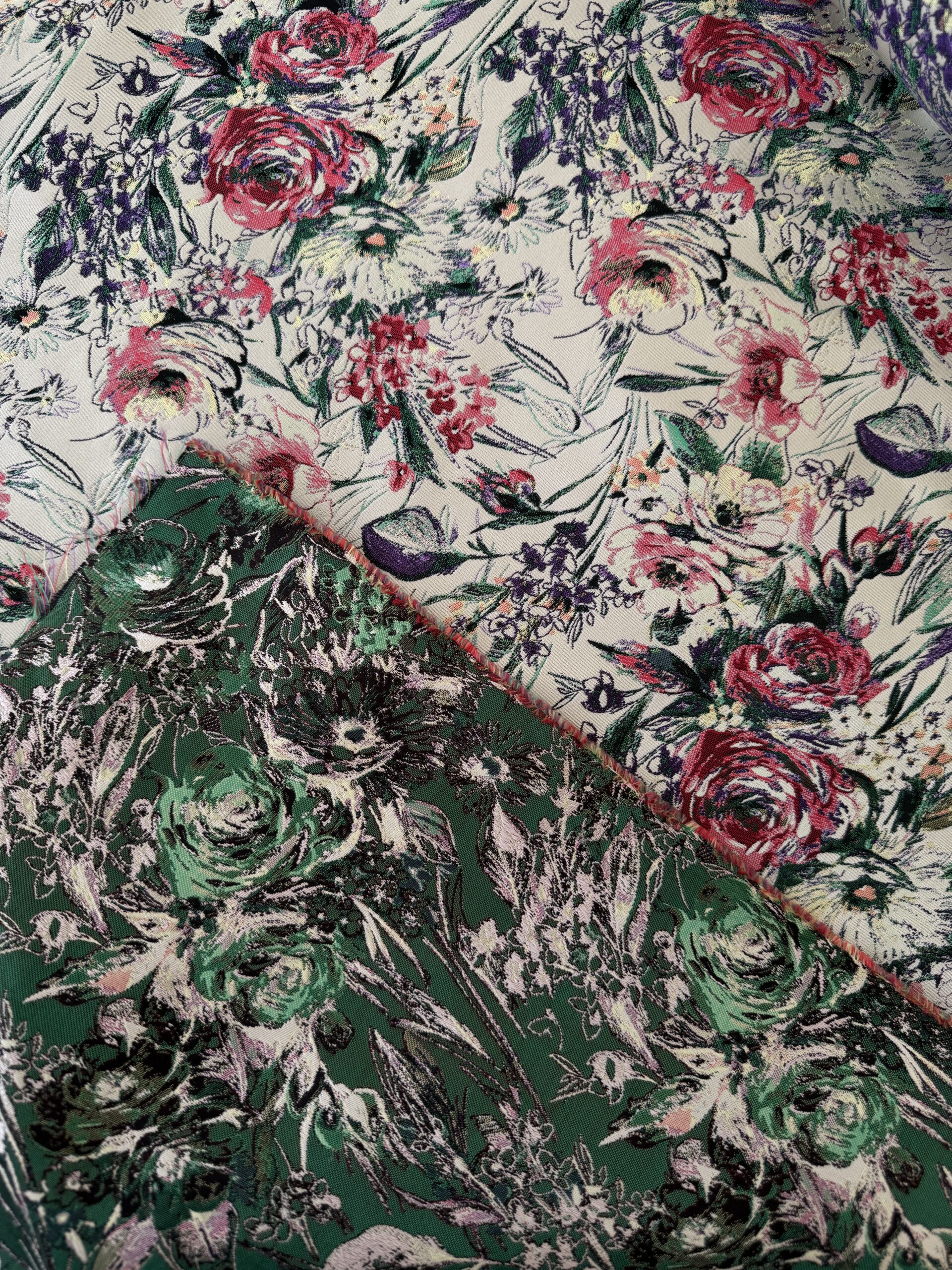 A floral jacquard fabric with a soft, semi-structured handle. Elegant yet versatile, ideal for skirts, dresses, tops, and accessories