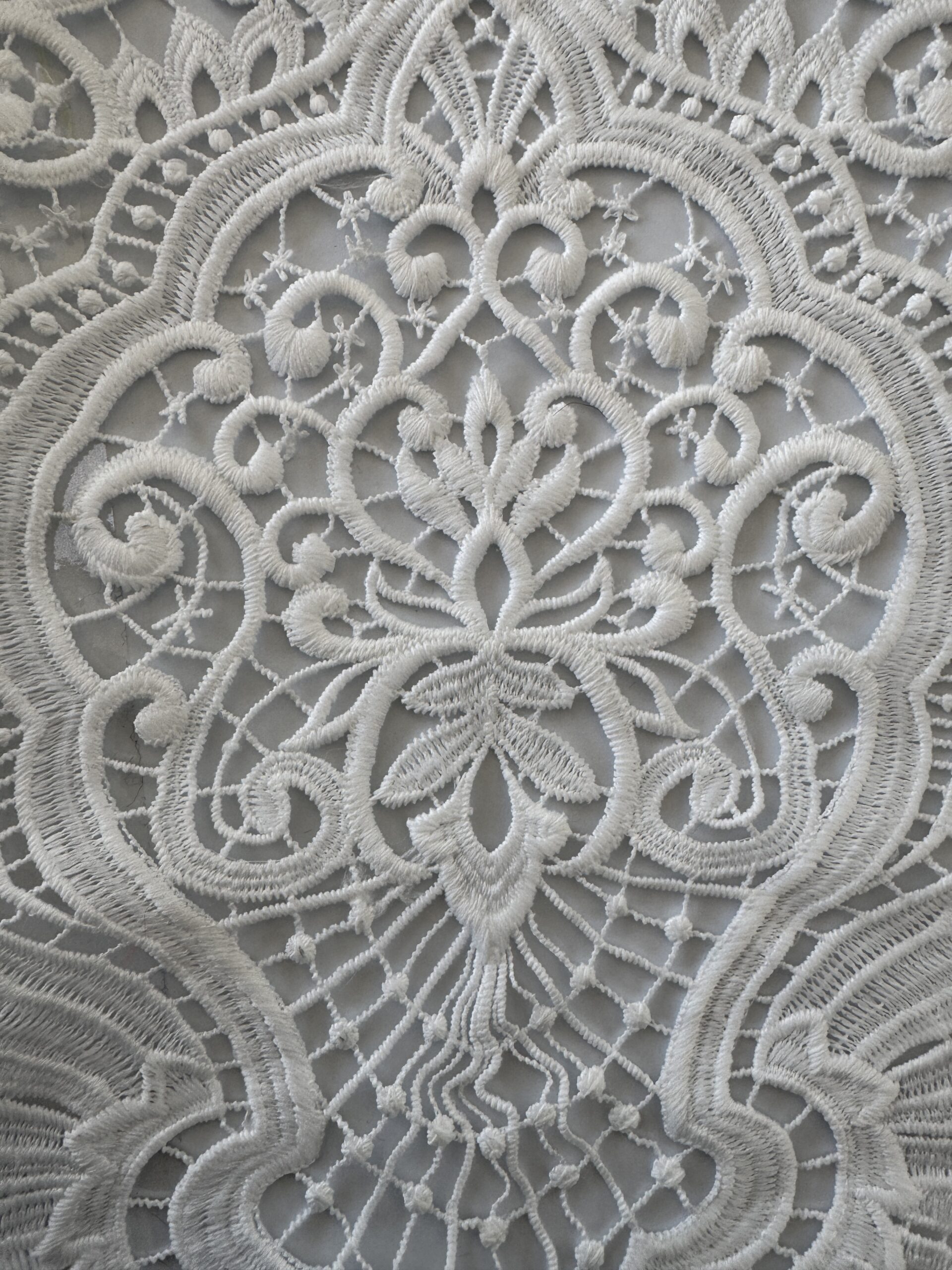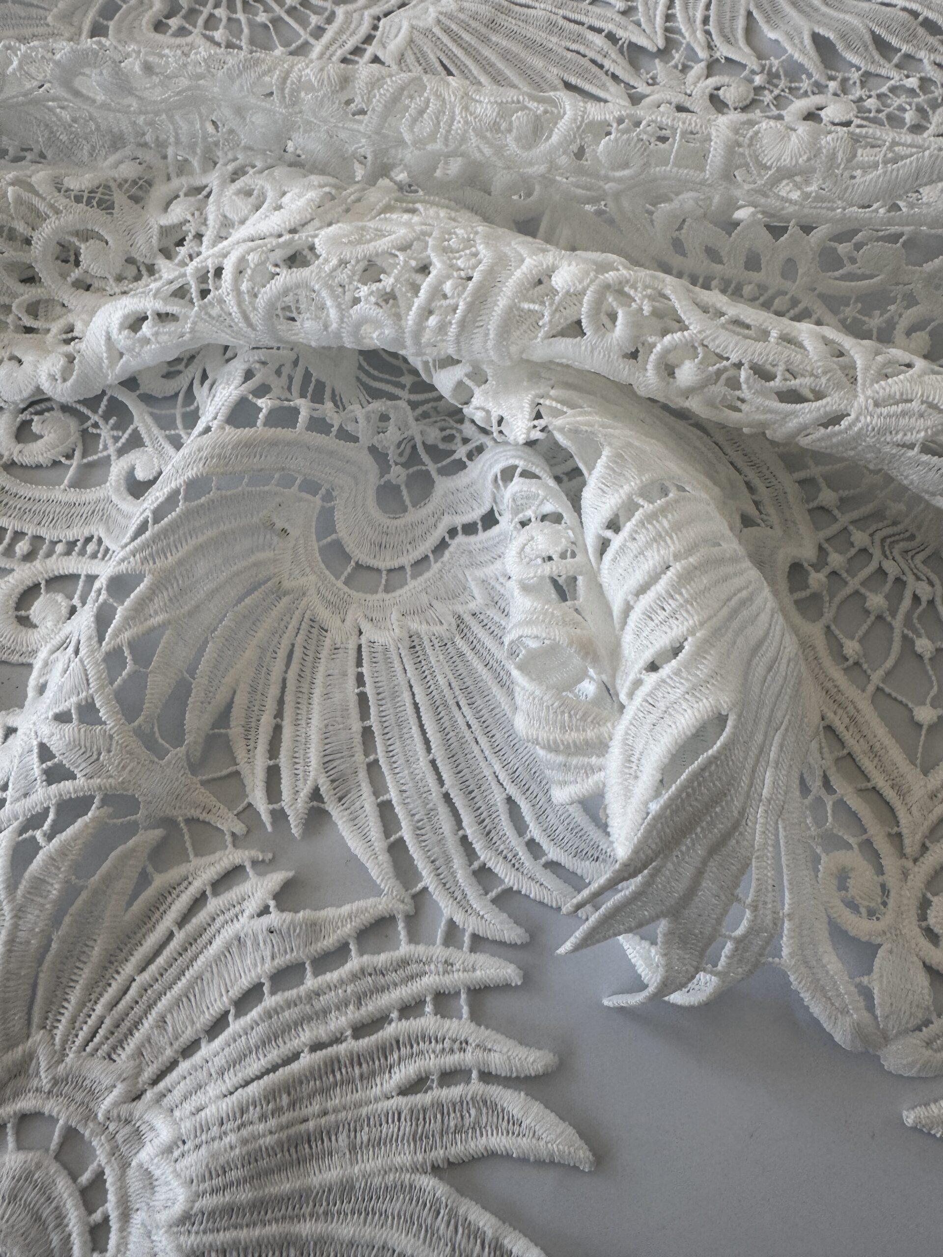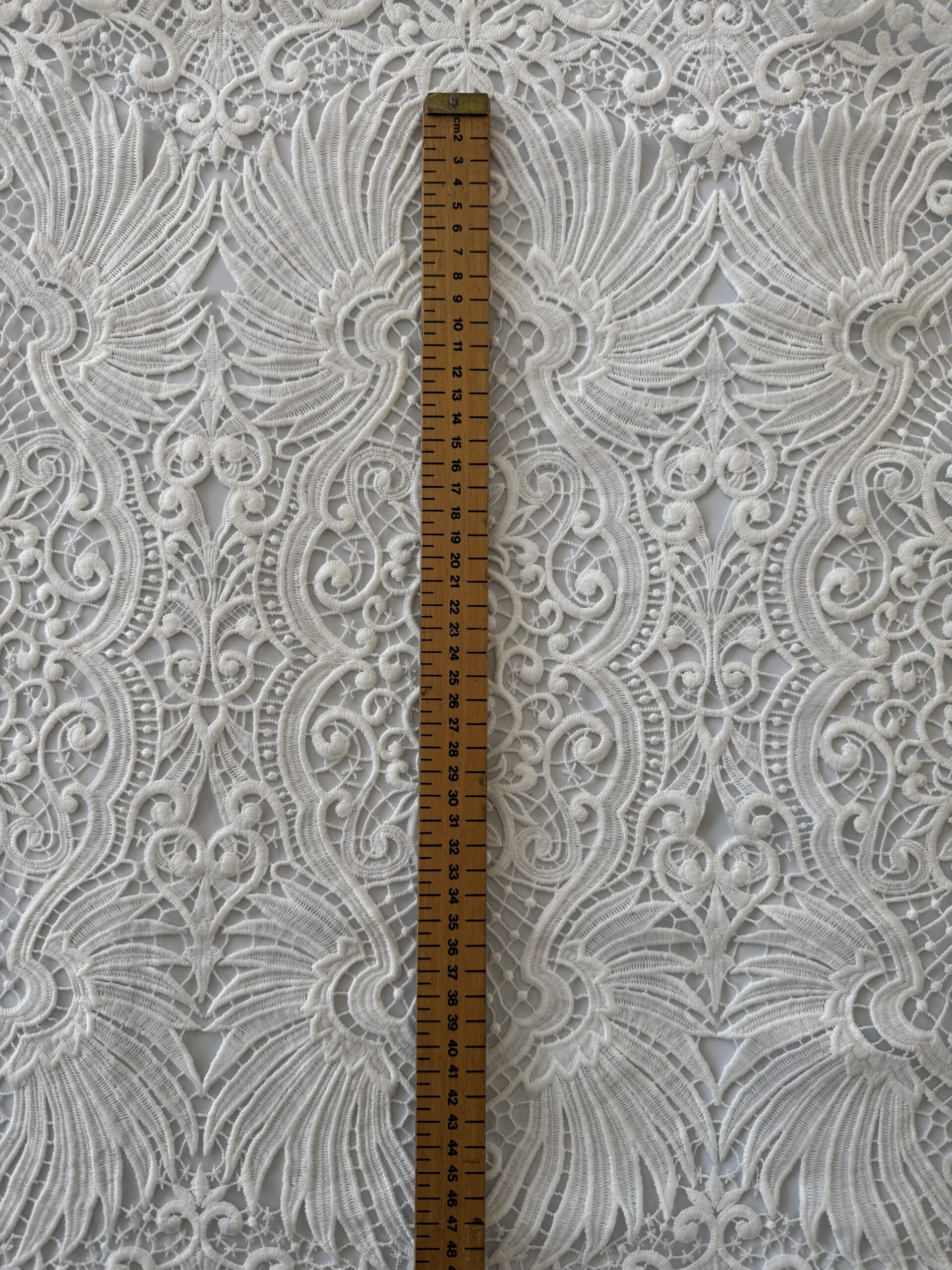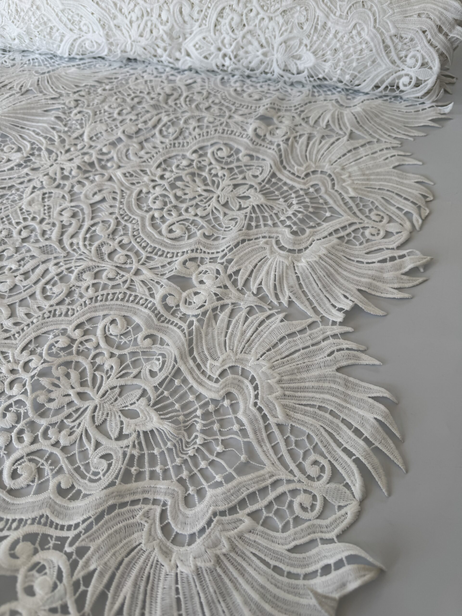 An ornate embroidered lace fabric with an intricate symmetrical motif and scalloped edges. Ideal for occasionwear, dresses, skirts, and more