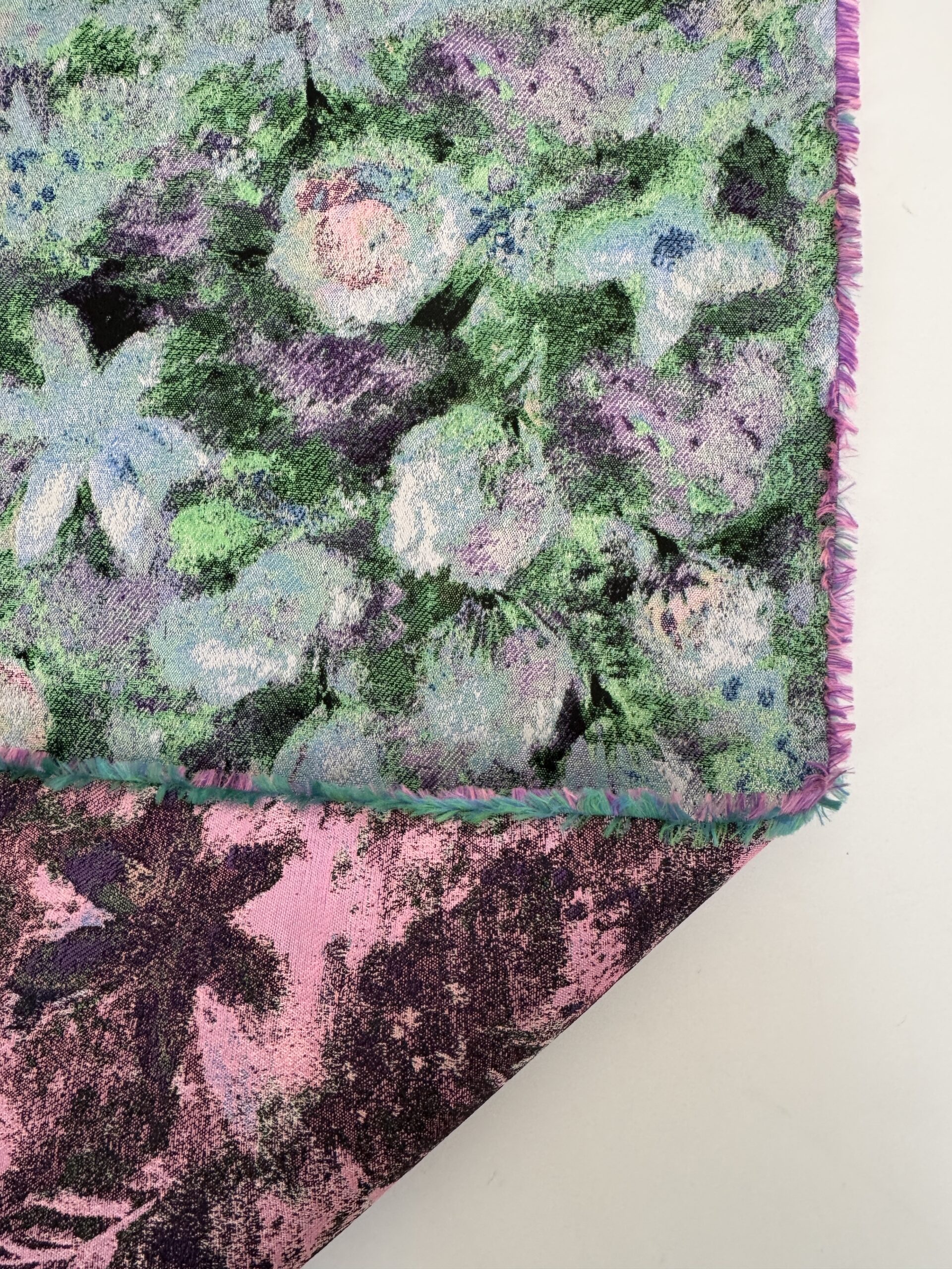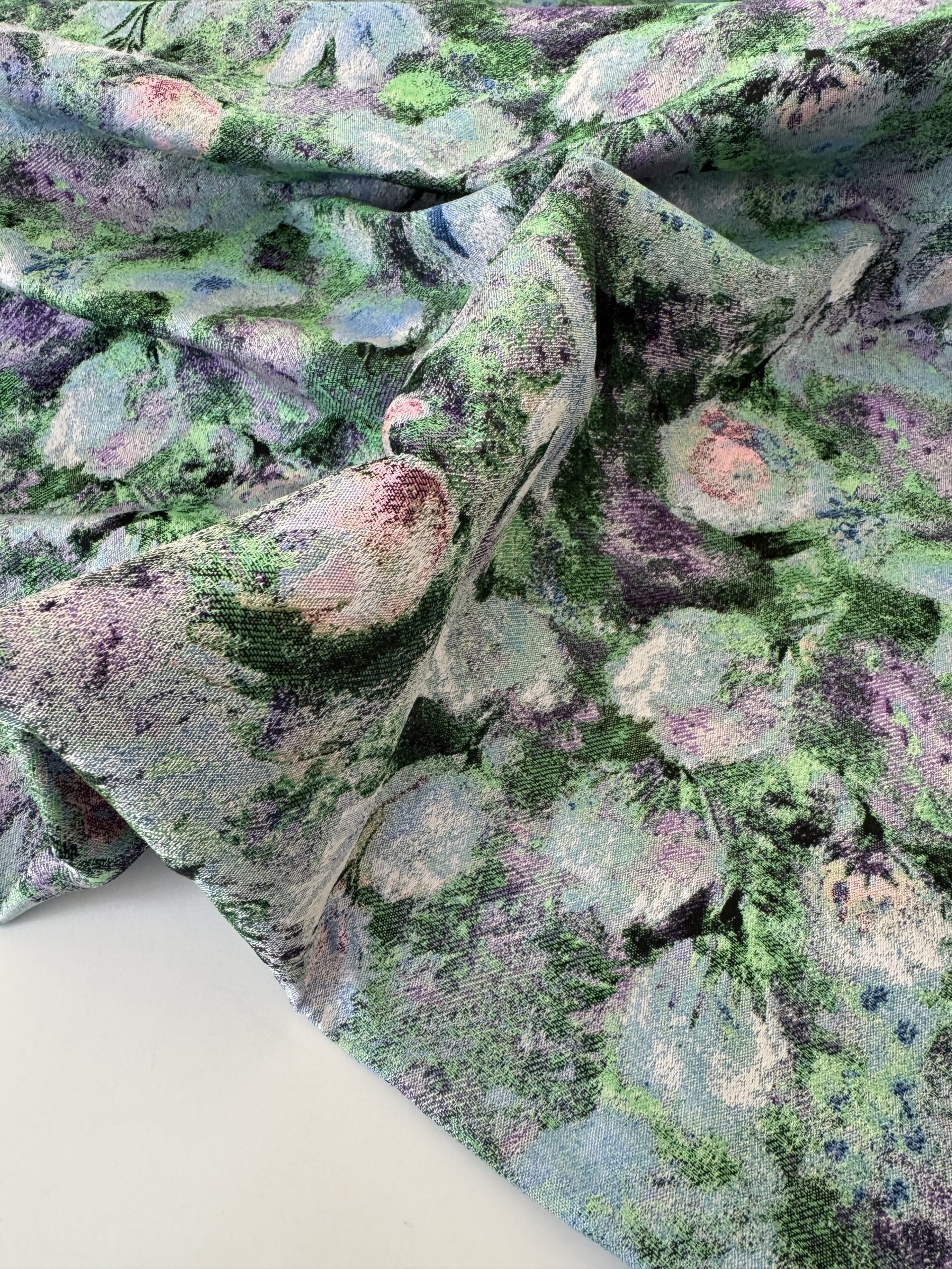 This jacquard features a floral pattern in muted greens, lilac, and blush tones. Its gentle structure and rich surface make it perfect for dresses, skirts, and bold fashion pieces.