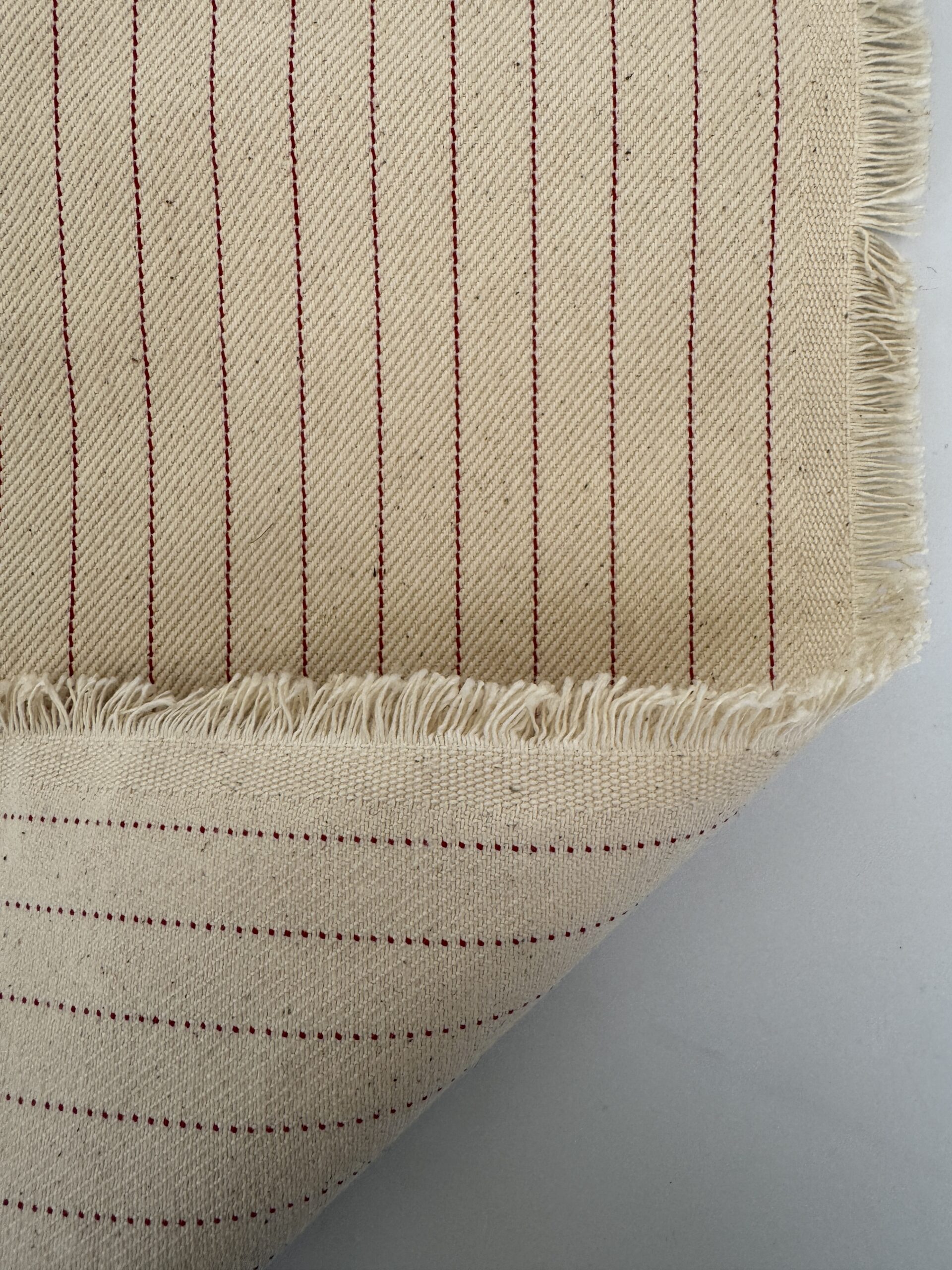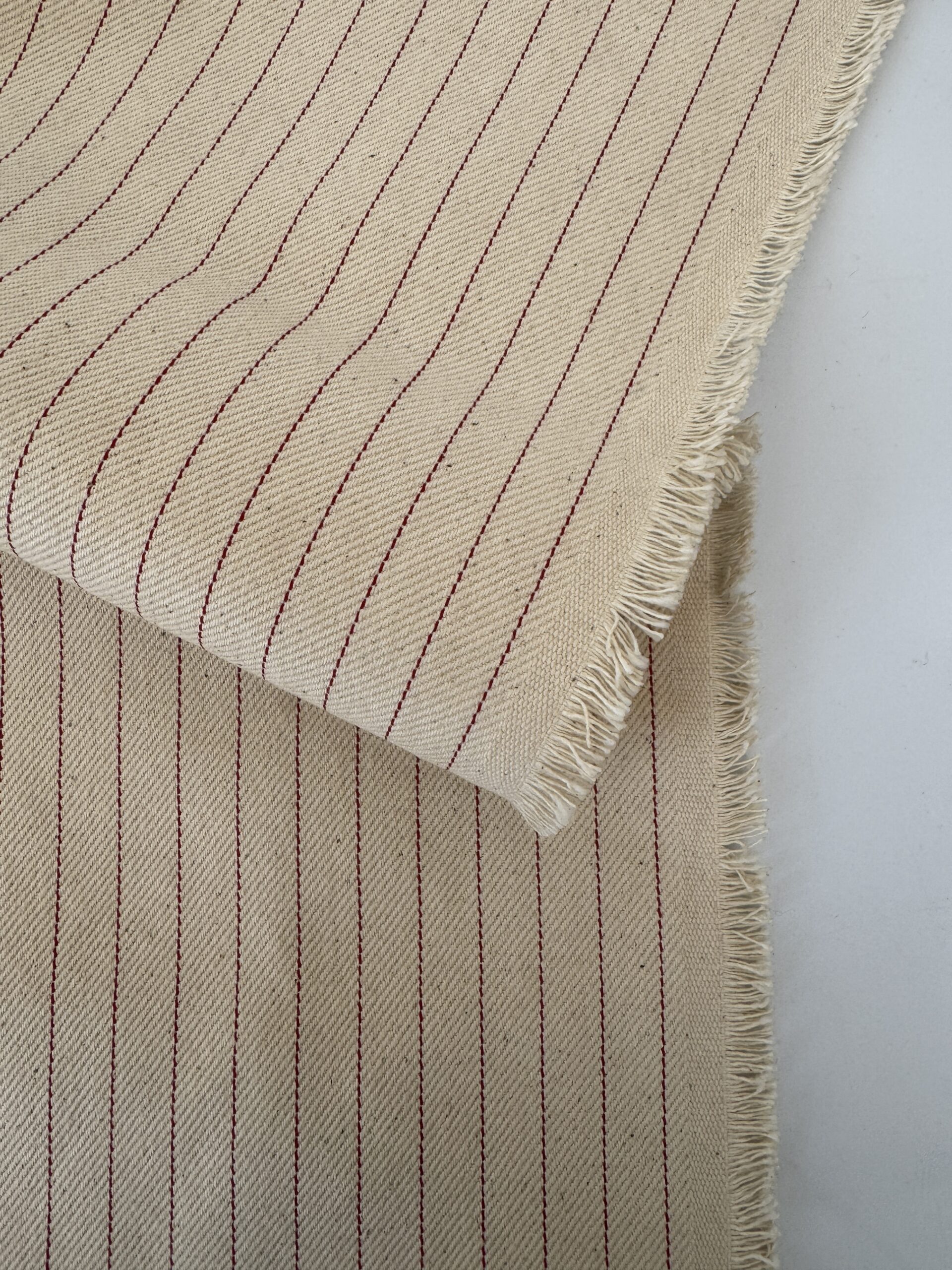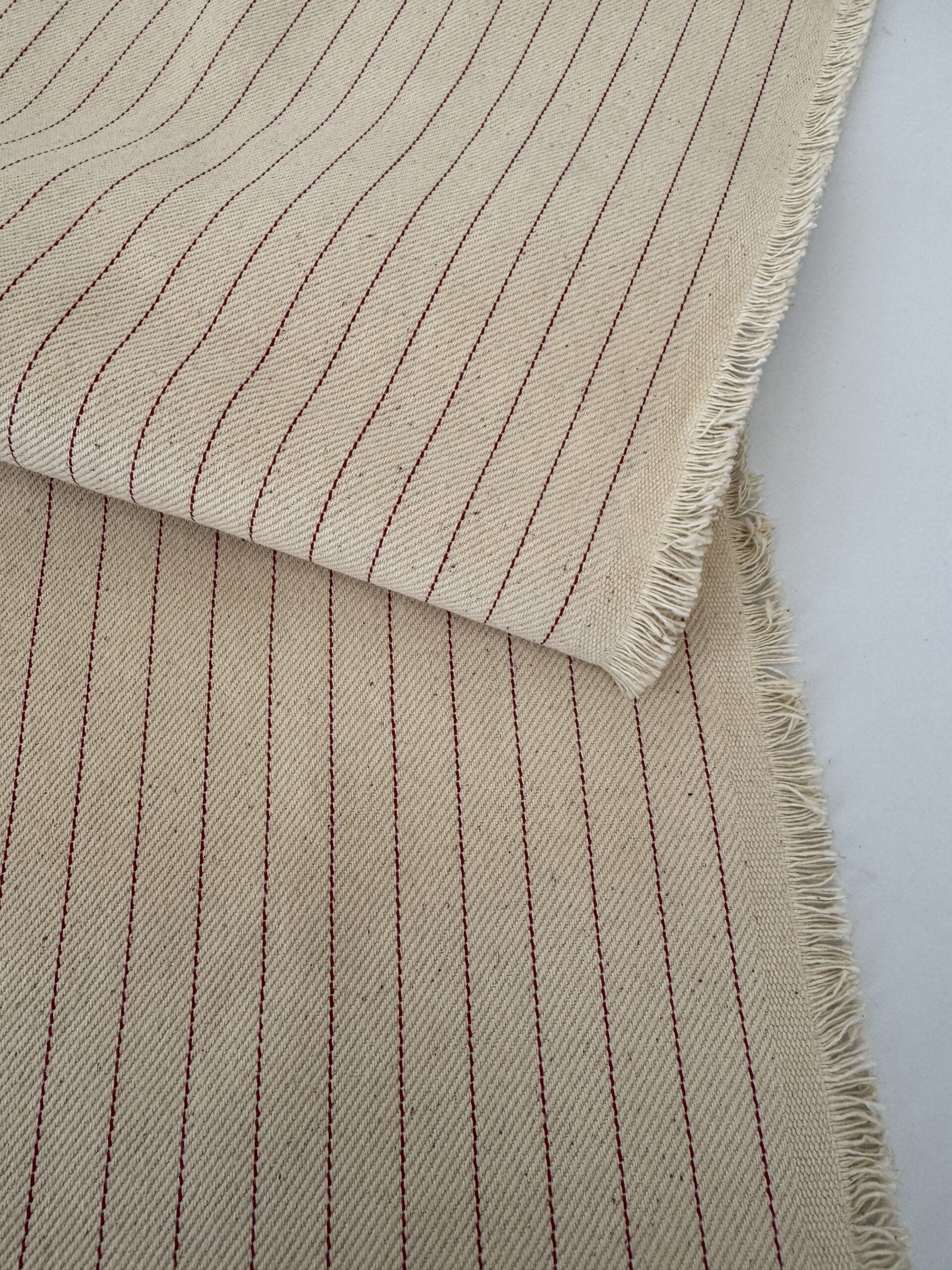 A natural colour denim with fine red pinstripes, woven in a sturdy twill for structure and subtle texture. Perfect for workwear, jackets, trousers skirts, tote bags and more.