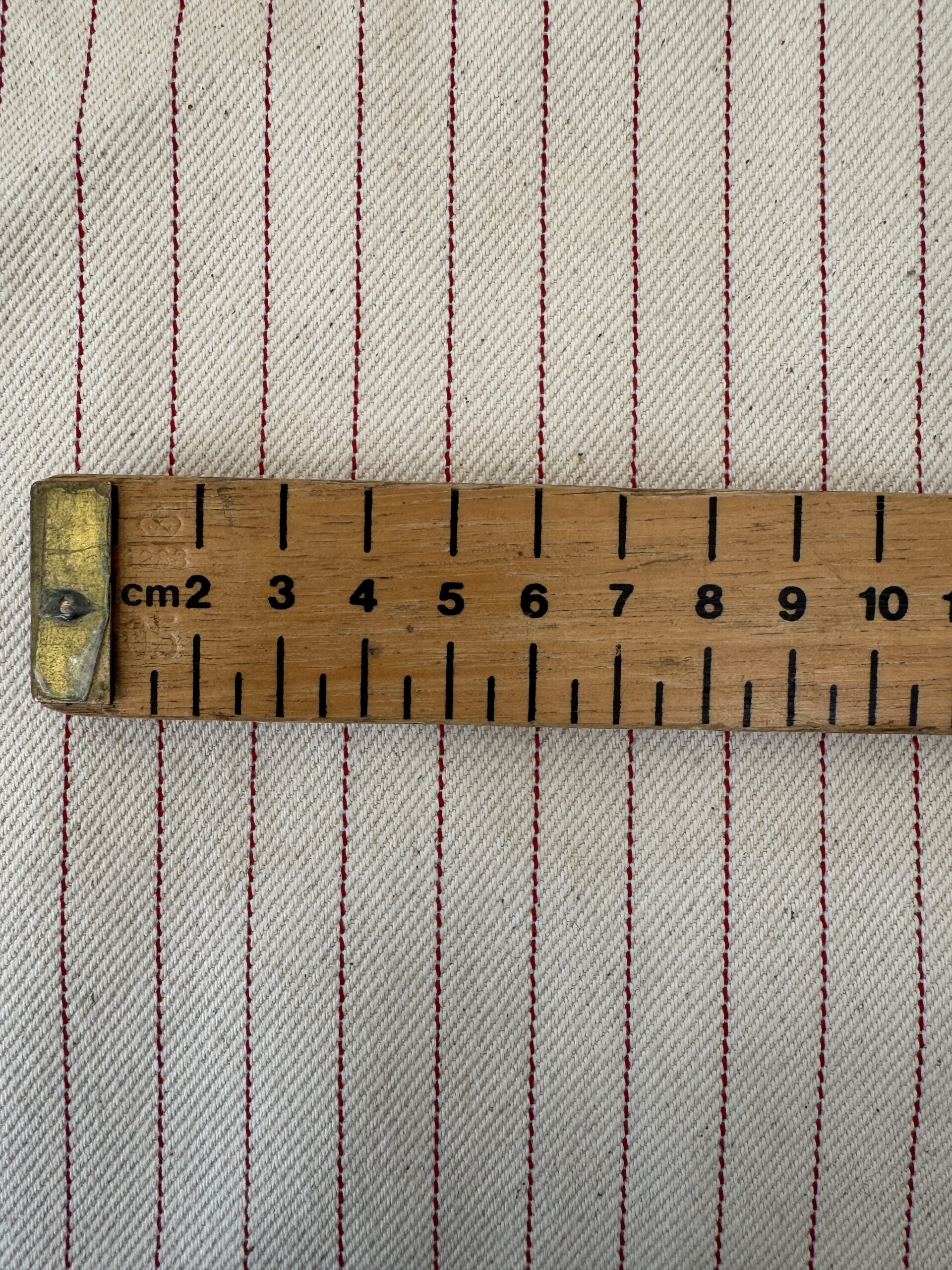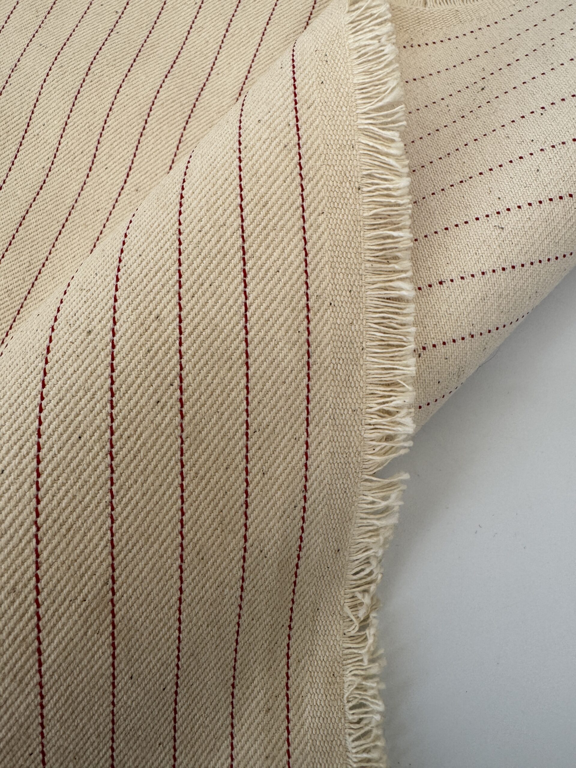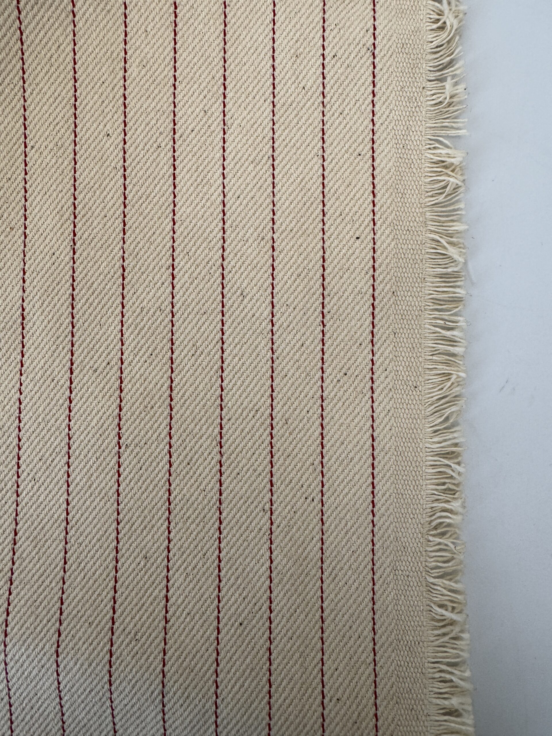 A natural colour denim with fine red pinstripes, woven in a sturdy twill for structure and subtle texture. Perfect for workwear, jackets, trousers skirts, tote bags and more.